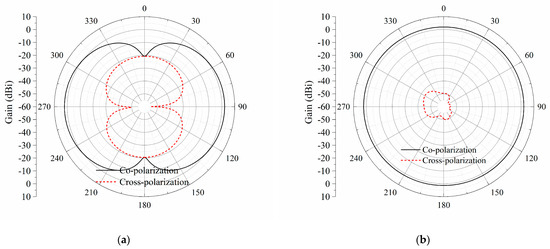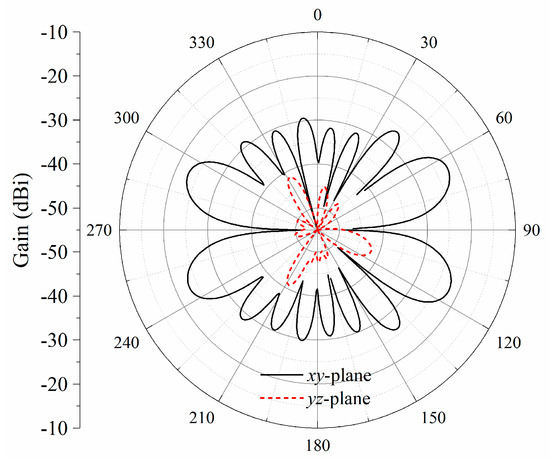 Figure 4 shows the simulated radiation patterns of the two planes for the printed dipole. In the yz-plane, the radiation pattern is omnidirectional with an average gain of about 2 dBi. Meanwhile, the corresponding cross-polarization level is extremely low at −55 dB. In the xy-plane, the main radiation directions are towards the +y-direction and −y-direction, sharing the same endfire gain of 2.15 dBi. There is no side lobe, and the gain in ±x-directions is −20.7 dBi. The corresponding cross-polarization level is maintained at lower than −22.3 dBi.