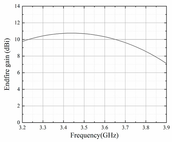 The endfire gain is estimated in Figure 9 within the frequency band from 3.2 GHz to 3.9 GHz, which is also the bandwidth of the printed dipole element. The peak gain of 10.7 dBi is achieved around 3.5 GHz. The endfire gain maintains higher than 10 dBi from 3.23 GHz to 3.66 GHz (430 MHz). When the frequency exceeds 3.66 GHz, the endfire gain decreases faster.