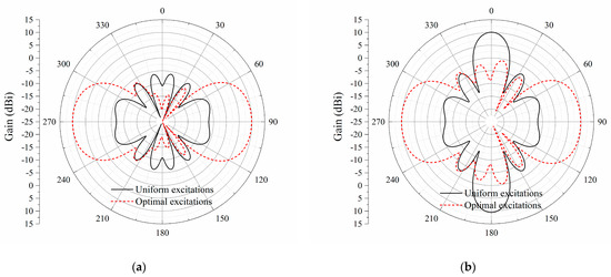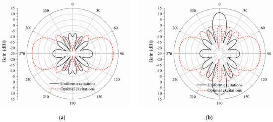 Compared with the uniform distribution of excitations, the radiation patterns of the proposed antenna array fed by optimized excitations are plotted in Figure 7. As shown in Figure 7b, for the antenna array with uniform excitations, a peak gain of 11.5 dBi occurs at ±z-directions. Nulls appear at the endfire directions in both the xy-plane and yz-plane. However, the bidirectional endfire radiation is generated by applying the optimized distributions of amplitudes and phases for the eight elements. The co-polarization endfire gain at ±y-directions is the same, i.e., 10.7 dBi, due to the same distance between the test receiving dipole and the printed dipole array. The half-power beam width (HPBW) is about 56°. The side lobe levels for the xy-plane and yz-plane are 15.8 dB and 12.2 dB, respectively. As shown in Figure 8, the cross-polarization levels in both the xy-plane and yz-plane are very low, especially in the xy-plane.