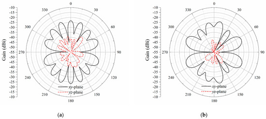 Simulated radiation patterns of the printed dipole array with an inter-element spacing of λ/3. (a) xy-plane; (b) yz-plane.