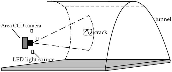 When collecting two-dimensional images of tunnel cracks, linear-array cameras are usually used as a tool for collecting images due to their small image distortion, large dynamic range, and non-tailing of images collected under high-speed motion. This acquisition system uses an area-array CCD camera and a high-definition industrial lens to collect tunnel crack images. Due to the lack of lighting equipment in the tunnel, the environment in the tunnel is poor, and the lighting conditions are harsh. So, it is necessary to ensure that the light source has a certain beam width when the image is collected. According to the spectral analysis and light source irradiation model, three rows of high-brightness LED light sources are configured around the lens of the area-array CCD camera. The beam width is more than 20 cm, the brightness is high, and the uniformity is good. In this way, sufficient light intensity and good light-intensity uniformity can be guaranteed to obtain better tunnel images. The principle of tunnel crack detection is shown in Figure 1.