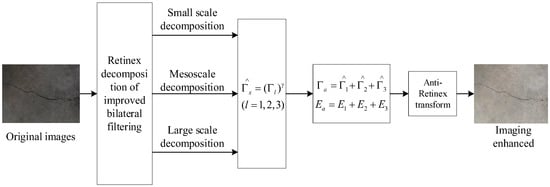 Due to the influence of insufficient light and uneven lighting inside the tunnel, the image part collected by the detection system has the characteristics of low contrast, resulting in incomplete or inaccurate crack information extracted, which is not conducive to the accurate evaluation of tunnel diseases. In order to improve the brightness and contrast of the image, fully display the crack information in the image, and the bilateral filtering has the ability of anisotropy and edge preservation [21,22], the multi-scale Retinex decomposition of the improved bilateral filtering is used to enhance the image. The improved bilateral filtering is used as the center of Retinex to decompose the image, which effectively improves the contrast of the image and reduces the distortion of the image because the bilateral filtering selects the appropriate filtering neighborhood size, which can not only maintain the edge and texture results of the image but also have a better smoothing effect. The enhanced tunnel image is used as the input information of the improved VGG19 network model, and the deep learning method is used to realize the efficient segmentation of the tunnel crack information, and the crack information is quantitatively characterized. The specific process of image detection method for tunnel cracks is shown in Figure 2.