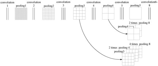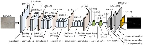 The size of the feature map is changed to 1/32 of the original map after Group 5 pooling; the fully connected layer in the original VGG19 model is replaced by convolutional layer 6, convolutional layer 7, and convolutional layer 8. In this case, the output heat map is still 1/32 of the original image, although the number of features has changed compared with the feature map output by the pooled layer 5. If the image output by convolutional layer 8 is directly used 32 times upsampling to restore the image to the original size and achieve basic semantic segmentation, but the obtained crack location information is rough, in order to restore the image to the original size and obtain the crack segmentation image with high recognition accuracy, it is necessary to design the skip structure of the full convolutional network [29,30]. In this paper, the skip structure fuses the output results of different pooling layers by upsampling to the same size and then uniformly uses 8 times upsampling to obtain the crack segmentation image with the same size as the input crack image and high recognition accuracy. The jump structure of the full convolution network is shown in Figure 6.