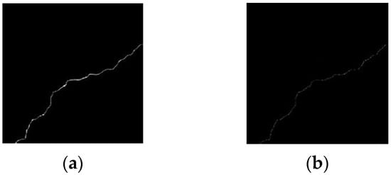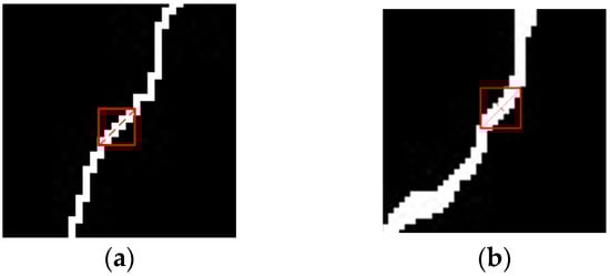 The thickness of the tunnel crack is uneven along the trend, and the length of the crack is calculated according to the length of the crack center line. Extract the crack skeleton from the segmented binary image, and the Zhang–Suen fast parallel-thinning method is used to obtain the skeleton map of the single-layer pixel [9]. The crack skeleton extraction results are shown in Figure 8.