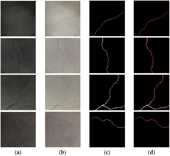 The detection results of the tunnel crack detection method proposed in this paper. (a) The 4 original images; (b) Retinex enhancement algorithm based on improved central filtering; (c) improved VGG19 network segmentation; and (d) detection result.
