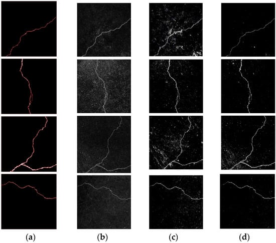 Tunnel crack detection comparison results. (a) Detection results by using the algorithm proposed in this paper in Figure 10; (b) detection algorithm based on Kirsch and Canny; (c) improved OTSU algorithm based on attribute-weighted naive Bayes algorithm; and (d) detection algorithm based on ST-YOLO.