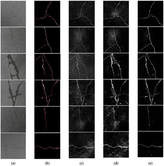 Tunnel crack detection results from different detection methods. (a) The 6 original images; (b) this article’s detection method; (c) detection algorithm based on Kirsch and Canny; (d) improved OTSU algorithm based on attribute-weighted naive Bayes algorithm; and (e) ST-YOLO detection algorithm.