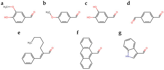 (a) Vanillin; (b) p-Anisaldehyde; (c) Catechaldehyde; (d) Terephthalaldehyde; (e) Amylcinnamaldehyde; (f) Anthracene-9-carbaldehyde; (g) Indole-3-carbaldehyde (I3A).
