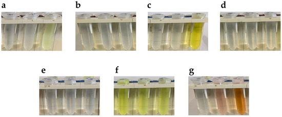 We developed a colorimetric assay considering that the spectroscopical features of the colored aldazine depends on the ring substitutions and on the solvent polarity and pH. Therefore, we explored the reactivity of seven aromatic aldehydes with the hydrazide group of carbidopa, in addition to vanillin, which was previously reported. The reaction was let to progress to the color development of the corresponding azines (Figure 2). In particular, the aromatic aldehydes varied in functional groups (Figure 2b–d) and in double-bond conjugation extensions (Figure 2e–g).