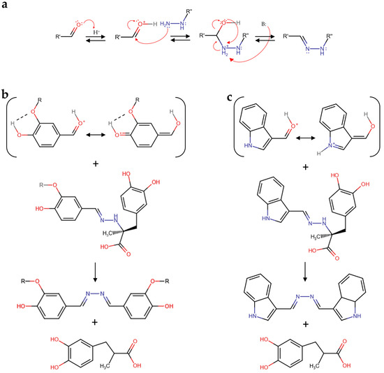 Although the elucidation of the molecular mechanism of aldehyde reactivity with carbidopa in acidified hydroalcoholic solution is out of the scope of this paper, it is worth noting that the carbidopa hydrazide functional group likely produced a hydrazone with all the aldehydes reported in Figure 3 via nucleophilic attack of the primary nitrogen atom of carbidopa against the protonated formyl group of each aldehyde and subsequent water elimination, as previously reported for vanillin (Figure 4a) [25]. The subsequent reaction of each hydrazone with another molecule of aldehyde to form the correspondent azine [25] appears limited by the steric hindrance. Accordingly, this nucleophilic attack of hydrazone could require a larger stability for the protonated formyl group of the free aldehyde. Being the formyl protonation favored by the resonance effects, i.e., the charge delocalization around the aromatic structure of the aldehydes here described, it is possible that such superior stability, in comparison to the other aldehydes, occurred via electron donation by the oxygen atom in position 4 to the benzaldehyde ring of vanillin and catechaldehyde, favored by the hydrogen bonding between the ortho-substituents (Figure 4b). Similarly, the lone pair donation from the nitrogen atom to the pyrrole ring of indole-3-carbaldehyde (I3A) delocalizes the formyl charge by resonance (Figure 4c). Together with the azine, a molecule of 3-(3,4-dihydroxyphenyl)-2-methylpropanoic acid should be formed, likely through a carbocation intermediate that should lead to the loss of chirality, previously identified as a metabolite of carbidopa [27,30].