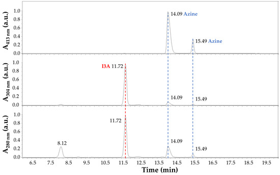 Chromatographic profile of carbidopa/I3A reaction products after 4 h at 70 °C in EtOH:H2O (1:1) with 40 mM HCl. Absorbance (a.u.) at 280 nm (lower panel), 304 nm (middle panel), and 413 nm (upper panel) was recorded by using the Diode Array Detector (DAD). The peak corresponding to I3A (C9H7NO) is highlighted by a red dashed line, and its absorbance is limited to the UV region (280 nm and 304 nm). Peaks corresponding to a I3A azine molecule (C18H14N4) are highlighted by blue dashed lines, and their absorbance covers UV and visible regions (280 nm, 304 nm, and 413 nm).