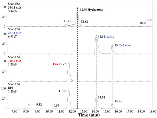 The LC-MS analysis of the reaction products after 4 h at 70 °C in EtOH:H2O (1:1) and 40 mM HCl is summarized in Figure 6 and Figure 7. In detail, the chromatographic profile recorded by using the Diode Array Detector (DAD) at 280 nm (Figure 6) shows four main peaks in the lower panel in our experimental conditions (see Section 2.3 LC-MS). The first one at 8.12 min was unidentified but tentatively associated with small impurities and an instrumental background. This peak absorbed at 280 nm only. The second peak in Figure 6 at 11.72 min (red dashed line) was ascribed to I3A (C9H7NO), with absorbance at 280 nm and 304 nm, as expected by the indole ring, and identified by mass spectrometry analysis, assigning a 145.9 m/z value at 11.77 min in Figure 7, corresponding to the [M + H]+ ion. This signal was also confirmed by comparison with a chemical standard of I3A analyzed in the same conditions. The third and fourth peaks in Figure 6 at 14.09 and 15.49 min (blue dashed lines) were associated with a I3A azine molecule (C18H14N4). Both peaks showed large absorbance at 413 nm (yellow), whereas there was no significant absorbance at this wavelength by the other peaks, as expected. The mass spectrometry confirmed, with a value of 287.1 m/z, the identity of these [M + H]+ ions, with retention times of 14.14 and 15.53 min, respectively (Figure 7). The remarkable splitting and difference in elution time for these peaks is here attributed to azine stereoisomers generated by a different mechanism of synthesis with respect to previously reported I3A-hydrazine condensation [31]. These isomers are likely associated with different double-bond configurations of the azine region and/or with different conformations for the rotation around the single bond between the nitrogen atoms limited by steric hindrance, analogous to allylic strain [32], to which the indole rings derived from I3A molecules contribute, in large part. However, further characterization would be necessary for a full description. Finally, a peak attributed to I3A-carbidopa hydrazone (C19H19N3O4), with a m/z value of 354.2 for the [M + H]+ ion, was found in trace amounts at about 12.50 min in Figure 7 (black dashed line), supporting the efficiency of I3A-to-azine conversion. A carbidopa molecule was not found (226.2 m/z) in our chromatographic conditions, likely requiring an LC system with eluents for ion pairing, which is not compatible with the other components here analyzed.
