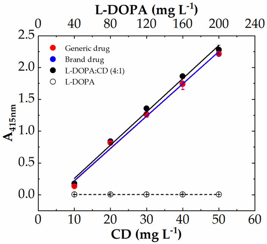 Colorimetric calibration curves of carbidopa (CD) in drug formulation L-DOPA:CD (4:1 w/w, black circles), Sinemet (blue circles), and Hexal (red circles), followed by the means of aldazine formation (λmax 415 nm) upon reaction with 10 mM I3A for 4 h at 70 °C in EtOH:H2O 1:1 and 40 mM HCl. The carbidopa content increased from 10 mg L−1 to 50 mg L−1, whereas L-DOPA increased from 40 to 200 mg L−1, also without carbidopa (white circles). Each point represents the mean ± SD of 8 replicates on a 96-well microplate. Data were fitted according to linear Equation (1).