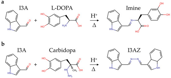 Scheme of the condensation reaction between the formyl functional group of indole-3-carbaldehyde (I3A) in acidified alcoholic solution and (a) the hydrazine group from carbidopa, giving the yellow indole-3-carbaldehyde azine (I3AZ), or (b) the amine group from L-DOPA, giving the uncolored imine.
