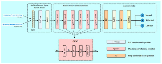 The fused feature is obtained through the audio-vibration signal fusion model. To achieve the fast and accurate fault diagnosis of bearings, it is important to obtain compact and comprehensive features. Therefore, a quadratic convolutional neural network (QCNN) [29] is used as the feature extraction module. The QCNN implicitly contains an attention mechanism. QCNN is also a simple and effective network which performs stably and competitively under various noise levels. Compared to other models, QCNN features a smaller model size, lower computational complexity, and shorter inference time. Quadratic neural units in QCNN inherently involve nonlinear transformations, thereby resulting in additional nonlinear mappings.