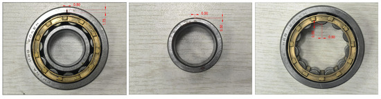 To simulate bearing failure, we utilized the electrical discharge machining (EDM) technique to introduce faults into the outer race of the 204EM cylindrical roller bearing. Initially, controlled EDM was applied to the outer race, involving rapid electrical discharges between the bearing and an electrode to cause localized melting and vaporization of the material. By adjusting parameters such as discharge current, pulse duration, and electrode shape and size, the desired fault was created. Subsequently, the bearing underwent a meticulous inspection to verify that the artificially induced fault matched the desired characteristics. An intentional defect, with dimensions of 1.75 mm in depth and 0.5 mm in width, was engineered on the inner side of the bearing’s outer ring using EDM. A defect was intentionally engineered on the inner side of the bearing’s outer ring using EDM, with dimensions of 1.75 × 0.5 mm (depth × diameter). To further analyze the vibration responses of different bearing component faults, defects were additionally introduced in the inner race and rolling element of the 204EM cylindrical roller bearing using the EDM technique. For the inner race defect, controlled electrical discharges were applied to create an intentional fault with dimensions of 0.5 × 0.5 mm (depth × width) on the outer side of the bearing’s inner ring. For the rolling element defect, a similar EDM process was utilized to produce an artificial defect sized 0.5 × 0.5 mm on the surface of a roller. The bearings containing these extra induced faults were carefully examined to validate the desired flaw dimensions and locations. The three types of bearing faults are displayed in Figure 2.