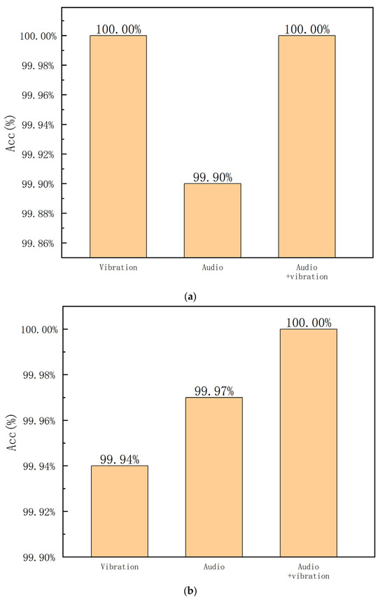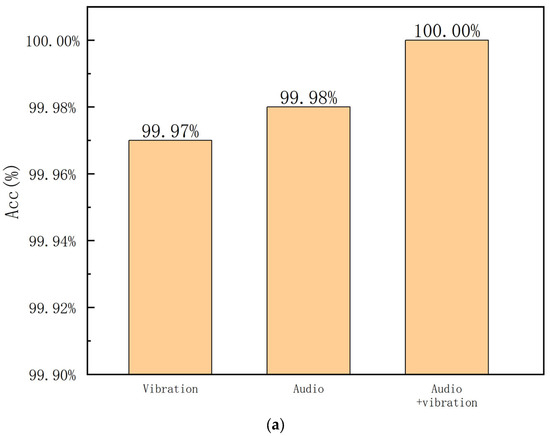 The evaluation results are provided in Table 3. As illustrated in this table, the accuracies that take the audio signal as an input are higher than those with vibration signals as the input. This observation indicates that the audio signal is more robust than the vibration signal in complex situations. Moreover, the accuracies with both audio and vibration signals as an input are higher than those with either modal signal as the input. Finally, the proposed method can achieve at least 98.81% in the complicated situation.