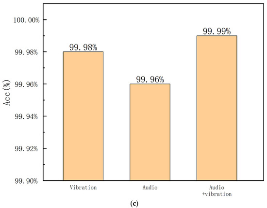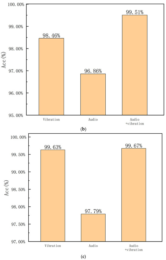 To verify the performance of the proposed method in the noisy conditions, the collected signals are mixed with white noise with an SNR equal to 5 dB. The input signals are the same as the first experiment. The accuracies are provided in Figure 7. It can be seen that the situation with the vibration signal as input is sensitive to noise, and the combination of both vibration and audio signals is more robust to noise. The evaluation results also confirm that the fusion of two modality signals, i.e., vibration and audio, is effective.