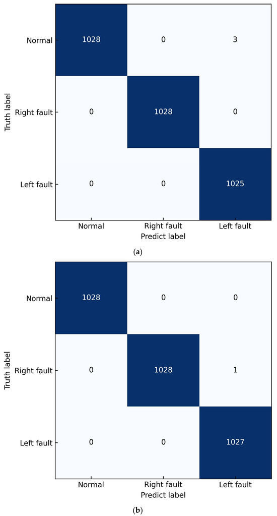 Moreover, in the experiment with a 5 dB SNR, the model with a single audio signal as input misclassifies three left-side fault samples into normal mode, and the model with signal vibration signal as input misclassifies a left-side fault as a right-side fault, as shown in Figure 8a,b, while the model with dual-channel signals as input could classify all samples correctly. Therefore, even though a single vibration or audio signal as input could achieve a high accuracy, it is not perfect and there are still incorrect judgements. However, the two-modality signal as input can achieve a higher accuracy by utilizing the complementary information of both of the two modalities.