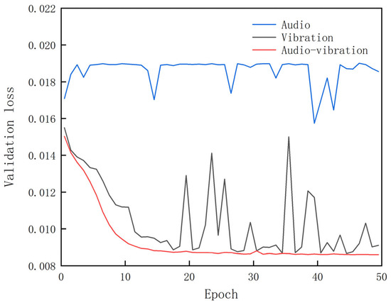 The loss curves on the validation set are given in Figure 9. We can find that the validation set loss of the model trained on audio signals remains very high. For the model trained on vibration signals, even though the loss steadily decreases with the increase in epoch, it occasionally fluctuates, indicating that the loss is not always stable. This phenomenon did not occur when using a dual-channel signal input, and when we added residual connections to the single-channel vibration signal model, the fluctuations were a bit lower. This suggests that the robustness of the model has been improved by using dual-channel inputs and adding residual connections. It can also be seen that the loss with both audio and vibration signals as input decays the fastest, indicating the superiority of fusion of both signals.