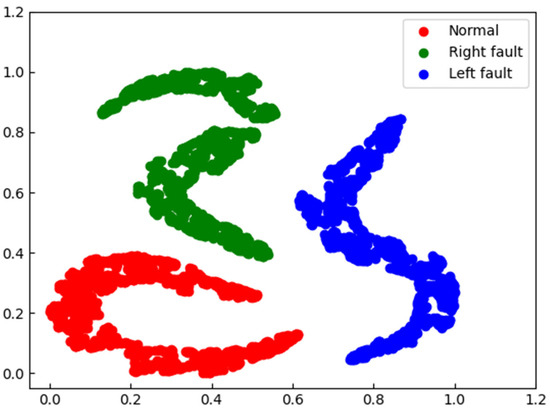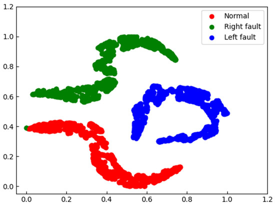 In order to further compare the features learned from single-channel and audio-vibration inputs, we used t-distributed stochastic neighbor embedding (t-SNE) [33] to visualize the output features of the last convolutional layer for single-channel vibration signal input and audio-vibration input, as shown in Figure 10 and Figure 11, where different colors represent different fault categories of the bearing. We can observe that when the input is the single-channel vibration signal, the red cluster representing the normal bearing is contaminated by the green cluster representing the faulty bearing on the right side, while in the dual-channel input, the red and green clusters are well separated, indicating that the dual-channel input has a better identification ability for bearing faults.