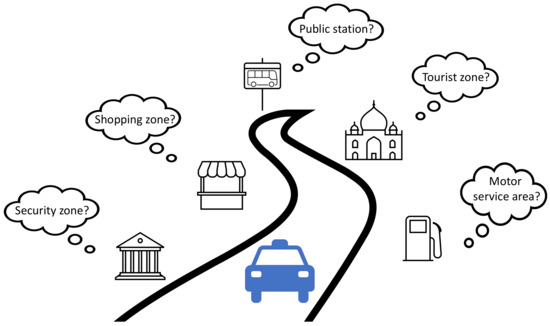 Nowadays, environment perception plays an important role in automotive applications. One aspect of environment perception is to geometrically detect and track surrounding objects as precise as possible, to assist the driver to avoid potential collisions with other road obstacles. Such systems have been widely employed in Advanced Driver Assistance Systems (ADAS) applications such as Adaptive Cruise Control (ACC) [1] and Automatic Emergency Braking (AEB) [2]. Another aspect is to interpret the context of the driving environment as close to the reality as possible. Existing research has shown that knowing the context of driving environment can help to adapt the vehicle control and plan strategies in a more predictive manner. Example applications include intelligent vehicle power management [3,4,5,6], adaptive vehicle control [7,8,9,10,11,12], adaptive positioning [13,14,15], adaptive parametrization of perception algorithm [16,17], and fleet management [18]. In this paper, we focus on the inference of the following five driving environments around vehicle’s vicinity, i.e., a shopping zone, tourist zone, public station, motor service area, and security zone, which are mainly inspired by the use cases of the TransSec project [19]. As the semantic clue to address each driving environment, we utilize the Point of Interest (POI) data from a navigation map. Figure 1 graphically illustrates this idea.