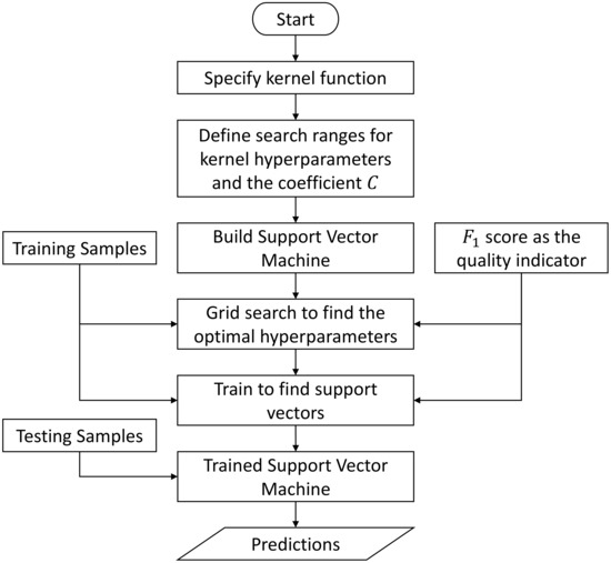 - Boser, B.E.; Guyon, I.M.; Vapnik, V.N. A Training Algorithm for Optimal Margin Classifiers. In Proceedings of the Fifth Annual Workshop on Computational Learning Theory, Pittsburgh, PA, USA, 27–29 July 1992; COLT ’92. pp. 144–152. [Google Scholar] [CrossRef]