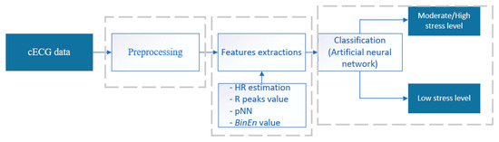 Block scheme of procedure for stress classification during driving. Feature list: heart rate (HR), R peaks value (local maximum in ECG), and percentage of differences between adjacent normal cardiac intervals (pNN) and binarized approximate entropy (BinEn).