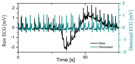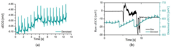 Figure 2b shows raw and denoised cECG time series during ST 2; in this experiment, the stage subject moved while driving according to a predefined protocol. Coarse artifacts were observed in the period from 5 to 10 s. Denoised cECG was shown by the dark green line, and the time axis was scaled.
