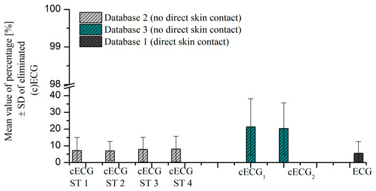 Comparison of the mean value of percentage [%] of eliminated samples ± SD for (c)ECG in Database 1 (marked by the dark gray bar), Database 2 (marked by the light gray bar), and Database 3 (marked by the dark green bar).