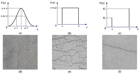 As the image acquisition process is easily affected by various factors such as light, equipment, and acquisition methods, the resulting pavement crack image may contain Gaussian, uniform, and salt-and-pepper (impulse) noise []. Confronted with small cracks or complex pavement environments, the probability density functions of various types of noise are shown in Figure 2. These noises will cause the feature and detail information of the crack to not be prominent enough, resulting in the information of the background region being stronger than the information of the crack region, thus affecting the effectiveness of the crack extraction. In addition, due to the large asphalt aggregate gap in asphalt pavement, if the grayscale value of the asphalt aggregate gaps is close to the value of the cracks in the pavement, it will cause great interference in the segmentation and extraction of the cracks in the image processing process.