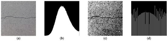 Histogram equalization is used to change the grayscale value of the image to a form that is evenly distributed throughout the grayscale range. This enhances the contrast of the image by adjusting the dynamic range of the grey values []. Figure 4 shows the results of the image processing. In the original image (a), there is a certain contrast between the background area and the crack area. However, affected by various interferences such as light and noise, the image is blurred and distorted, losing most of the details of the crack profile. In addition, the grayscale value of each pixel in the original image histogram (b) is extremely unevenly distributed. A single peak is clearly visible. In the grayscale image (c) after histogram equalization, the contrast between the background area and the crack area is significantly enhanced. The crack texture and profile are clearly visible and the image is rich in detail. And in the equalized histogram (d), the gray level of each pixel is relatively evenly distributed, which enhances the quality of the image.