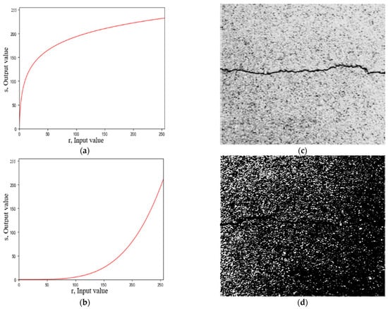 Commonly used grayscale nonlinear transformation methods include logarithmic transformation and exponential transformation (gamma transformation) (Singh and Bhandari 2020). Figure 6 shows the function images and results of these two grayscale nonlinear transformation methods. Although the logarithmic transformation method improves the contrast between the crack area and the background area, it does not significantly weaken the noise from the asphalt aggregate gap. The exponential transformation method reduces the grayscale value of the entire crack image; however, it does not highlight the features of the crack area or weaken the noise from the asphalt aggregate gap.