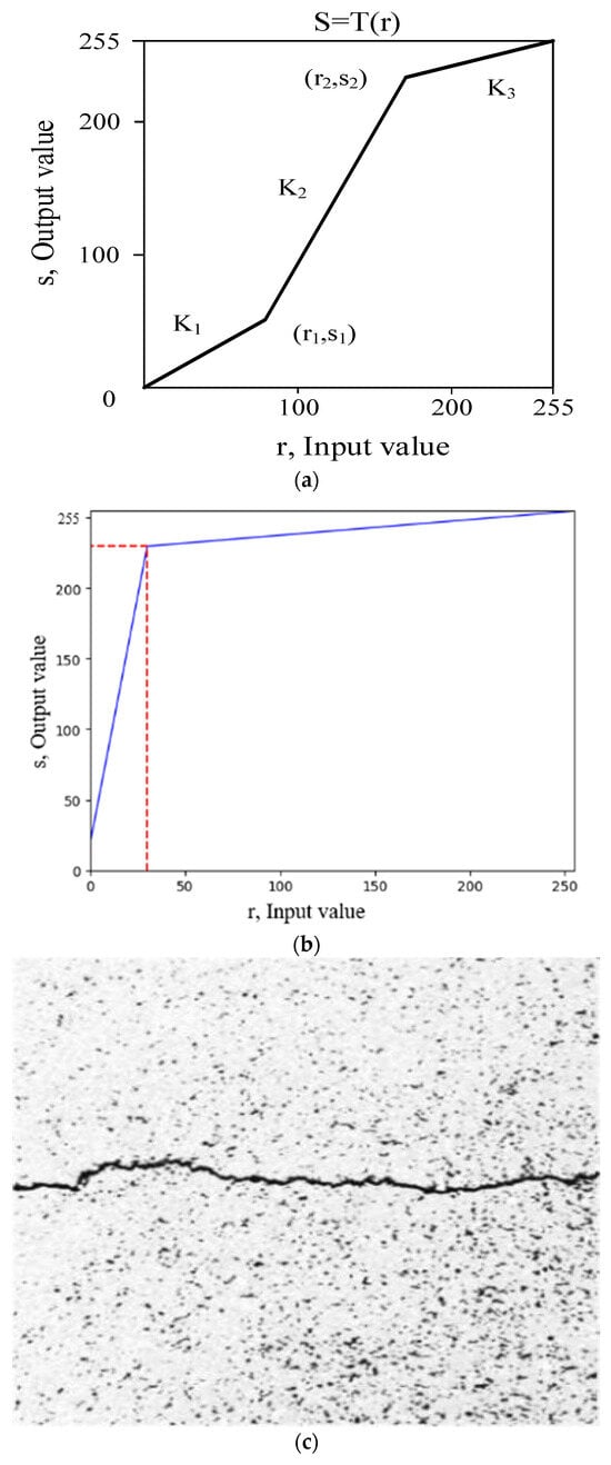 Here, S is the output gray level and r is the input gray level. K1, K2, and K3 are the three polyline slopes. (r1, s1) and (r2, s2) are the two inflection point coordinates of the polyline. Figure 7a shows the grayscale segmented linear function. The image grayscale range ((0, r1), (r1, r2), (r2, 255)) can be stretched or shrunk corresponding to the slope of different polyline segments to (0, s1), (s1, s2), (s2, 255), respectively, as needed. The cracks in the asphalt pavement image are the darkest. To achieve a complete retension of their characteristics during a segmented linear grayscale transformation, the smaller values of r1 and r2 shall be selected as much as possible without losing the features of the region of interest. Therefore, through a comprehensive analysis of the image features and processing results of the crack dataset, in this paper, r1, r2, s1, and s2 are, respectively, set to 0, 30, 20, and 230. Figure 7b shows the segmented linear function used in this paper.