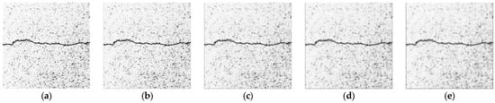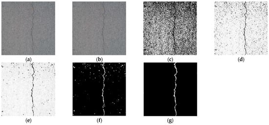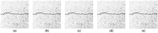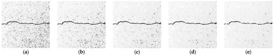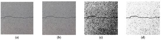 The median filtering method selects a window centered on each pixel point. It sorts the grayscale value of each pixel point in the window in a one-dimensional space. Then, it assigns the grayscale value of the middle sequence position to the current pixel point []. For images with obvious noise, since the grayscale value of the noise pixel point is significantly higher than that of the surrounding points, the grayscale value of the noise pixel will not be ranked in the middle of the sequence, and this achieves the removal of noise. Figure 10 shows the results of median filtering. By increasing the size of the filter template, median filtering becomes increasingly effective in removing the noise areas from the gaps between asphalt aggregate. When the template size is 9 × 9, most of the noise can be filtered out while preserving the crack details. However, as the size of the filter template increases, the clarity of the crack profile decreases and may even fracture.