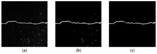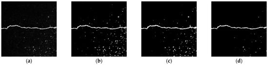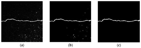 Figure 15 shows the processing results of the local threshold + opening operation. Figure 15b shows the image processing results binarized using the Sauvola algorithm in the local threshold method. Although the details of the crack area are relatively complete, there are still some isolated noise points in the asphalt aggregate gap. To solve this problem, the opening operation in the mathematical morphology method is used to eliminate these noises. As shown in Figure 15c, the opening operation can eliminate the burr in the crack area and the isolated noise from the asphalt aggregate gap. It can preserve the integrity of the original crack as much as possible, but some details of the crack profile may be lost.