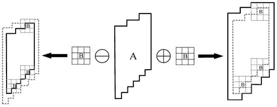 Mathematical morphology refers to a mathematical tool [] for analyzing images based on their morphology. The commonly used morphological operations include expansion, corrosion, opening operation (corrosion first, then expansion) [], and closing operation (expansion first, then corrosion) []. Figure 13 shows a schematic diagram of an expansion and erosion operation.