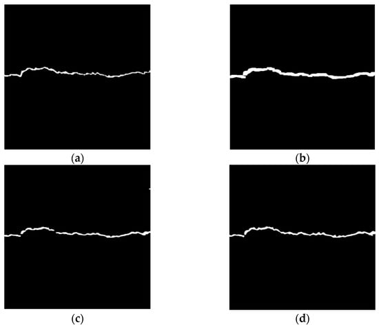 Figure 11 shows the processing results for these two global threshold methods. Figure 11b displays the processing results for a larger threshold (T = 200). Although it ensures that all input images completely filter out the noise from the asphalt aggregate gap, it leads to a considerable loss of details in the crack area, and even leads to breaks. In Figure 11c, the Otsu algorithm preserves relatively complete information about the crack profile, but fails to filter out noise from the asphalt aggregate gap.