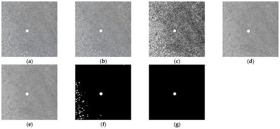 In the Gaussian filtering template, the weight coefficient of the element is calculated using the two-dimensional Gaussian distribution function based on the distance between the current pixel and the pixel to be processed. The point with a shorter distance from the pixel to be processed is given a larger weight, otherwise it is given a smaller weight []. Figure 9 shows the results of Gaussian filtering. Compared with using mean filtering, this method causes less damage to the image details and the overall image is smoother. Using different templates of Gaussian filtering does not have a significant impact on the appearance of the image. Furthermore, there are no obvious weaknesses in the noise areas of the asphalt aggregate gap.