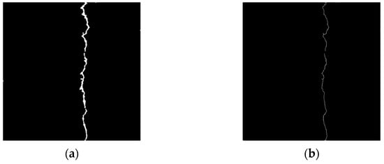 Figure 24b shows the result of the connected domain threshold method processing. It takes advantage of the fact that there are fewer pixels in the connected domain of the crack burr branch. It can effectively remove the crack burr and the isolated noise points omitted after distinguishing the connected domain. The crack skeleton binary image is traversed after burr removal. The crack pixel length l represents the number of cracks detected at present. The actual crack length L is as shown in Equation (14).