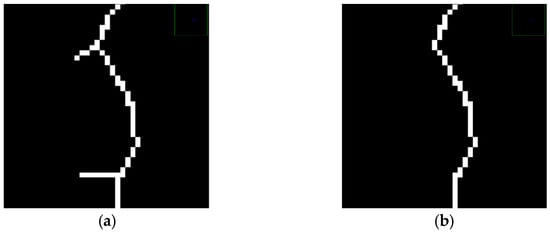 For images of crack skeleton extraction, there are still many crack burrs, as shown in Figure 24a. In order to avoid the impact on the calculation of the subsequent crack length, this paper uses the connected domain threshold method to remove crack skeleton burrs based on the concept of eight neighbors. The specific steps are as follows: