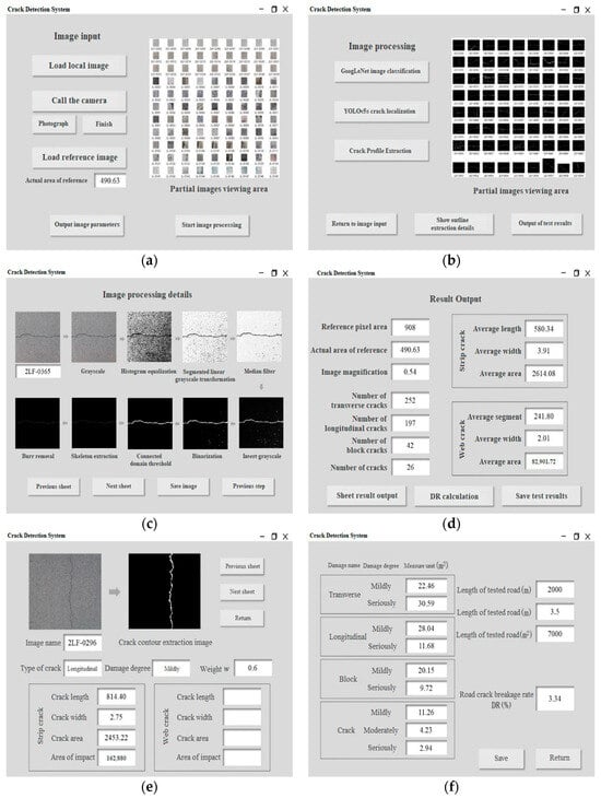 Figure 25a illustrates the loading of the local image for the image detection input, along with the importing of the reference image and manual inputting of its reference area of 490.63 mm2. The image browsing area depicted in Figure 25b displays the crack binary maps obtained after the crack contour extraction process. Figure 25c illustrates the image processing detail interface, which reveals the process diagram of each image as it undergoes various stages of image processing. This interface allows for browsing and saving. Figure 25d presents the output interface displaying the complete detection results of the crack image. Firstly, the image magnification β is calculated as 0.54 mm2/pixel through the pixel area of the reference and the actual area. Secondly, a total of 252 transverse cracks, 197 longitudinal cracks, 42 block cracks, and 26 cracks were counted in the images to be detected. Lastly, it was determined that the average length of the block cracks was 580.34 mm, with an average width of 3.91 mm and an average area of 2614.08 mm2. Additionally, the average block size of the mesh cracks was 241.80 mm, with an average width of 2.01 mm and an average area of 82,901.72 mm2. Figure 25e depicts the results interface for a single crack image detection. Firstly, the image browsing area displays both the original image of each crack and the extracted image of each crack. Secondly, the crack type is determined. If the crack is a strip, the system displays parameters including length, width, area, and impact area. If the crack is a mesh, the system displays parameters including blockiness, width, area, and impact area. The system assesses the degree of damage to the cracks based on present values and outputs the calculated weights. Figure 25f illustrates the interface for calculating the damage rate of pavement cracks. The interface shows statistics on the left side, indicating the impact area of each type of crack at different levels of damage. On the right side of the interface, users can manually enter the length and width of the test section, with dimensions of 2000 m and 3.5 m, respectively, to obtain the total detection area of the road segment. The pavement crack damage rate (DR) can be calculated using Equation (16) [], which yields a result of 3.34%.