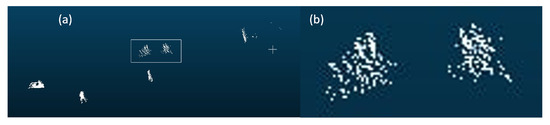 Using multiple-frame point clouds can effectively compensate for information. Multiple-frame point clouds, also called spatio-temporal data, can be used in several fields. For example, with spatio-temporal data, 4D dynamic scenes can be reconstructed [5,6]. In the detection field, using multiple-frame point clouds may alleviate the sparsity problem in 3D object detection. Although the above example shows the detection failed in two consecutive frames, they perform detection independently without all the data together to improve detection. With a proper fusion scheme, using multiple point cloud frames can be similar to using a denser line LiDAR. One intuitive approach is concatenating the points at input time, that is, aligning the multiple frames of point clouds into a single scene for input. Besl [7] proposed the classical iterative closest point (ICP) algorithm, which laid the foundation for point cloud registration. This method uses the sum of Euclidean distances between all points of two point clouds as the matching cost for iterative search until the matching cost is minimized. Then, the transformation matrix between the two point clouds is computed. We conducted a simple experiment using the point concatenation method, as shown in Figure 3, using ICP [7] to align the point clouds. However, this alignment approach has its drawbacks. It requires many iterations, resulting in a long computation time. Also, a suitable initial position must be provided. As we are dealing with large outdoor datasets, most objects are moving and have different velocities. The movement poses further challenges to registration, which is usually restricted to stationary objects. Despite the increased point density, shadows appear on some objects. When magnifying the point cloud representing small objects in Figure 3b, it can be observed that the alignment effect is unsatisfactory, leading to shadows on the small objects [8,9,10].