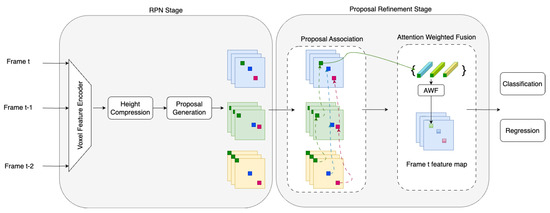 The framework of the 3D object detection method based on multiple-frames fusion is shown in Figure 4. We use the LiDAR point cloud as the input and adopt the two-stage detection framework: region proposal network (RPN) and proposals refinement network. In the preprocessing stage, we use a voxel feature encoder (VFE) to encode the input point cloud data as voxels. In the RPN stage, we extract features from voxels and generate the prediction according to the anchor feature to obtain high-quality 3D proposals. Then, non-maximum suppression (NMS) is used to select candidate proposals in the proposal refinement stage. We associate and merge the features of 3D proposals from consecutive frames. Cosine similarity is used to associate proposals in consecutive frames, and the AWF module is used to adaptively adjust the features from matched proposals. Based on the fusion results, the bounding box classification and regression determine the object category, size, and location.