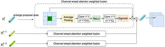 As shown in Figure 5, the input proposal is first enlarged to 3 × 3 on the feature map to include the surrounding areas for additional information. The module performs average pooling on the input feature map, which reduces the spatial dimensions to 1 × 1 while preserving the number of channels. The module applies a 1 × 1 convolution on the pooled tensor, which reduces the dimension of the channel. This is accomplished using a smaller number of output channels (C/r) compared to the input channels, which projects the feature into a lower-dimensional space and removes redundant information. The output tensor is passed through a ReLU function, which introduces nonlinearity into the feature representation. Following this, the module applies another 1 × 1 convolution, which expands the dimensionality of the feature back to the original number of channels. This convolution is followed by a sigmoid activation function, which scales the learned weights to the range [0, 1]. These weights represent the importance of each channel in the input feature map, with higher weights indicating more discriminative features. Finally, the input feature map is multiplied element-wise with the learned weights to obtain a weighted feature map. That is,