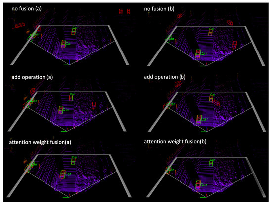 In Figure 6, we use a set of samples from the Kitti validation set as an example in ablation experiments. The output results are visualized to compare the differences between the models qualitatively. (a) and (b) refers to two multiple frames. Green boxes refer to the ground truth boxes, and red boxes are prediction results. The “no fusion” method refers to our backbone network [4], which serves as the baseline for comparison in this experiment. We compare the detection results of two fusion techniques, “add operation” and “attention weighted fusion”. The association in both cases is performed using the cosine similarity metric. In frame (a), the minimum number of object points on the left side of the point cloud is 42, while in frame (b), the minimum number of points representing objects is 64. As can be seen from the figure, there are difficulties in detecting side objects in the “no fusion” method without information from adjacent frames, and false positives appear due to interference from irrelevant points. Utilizing a feature-merging strategy that integrates features from multiple frames has been shown to be effective in detecting objects with sparse points. Based on our analyses, the proposed method can detect objects accurately by using the AWF module to assign weights adaptively. Additionally, the AWF module adds a small computational cost. The additional overhead is two 1 × 1 convolution layers for each frame computation. It takes 2.886 ms for AWF to fuse features for the current frame on GPU V100.