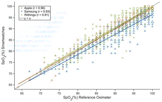 The individual datasets for all smartwatches were fitted with a regression line using the least squares method (Figure 1). While the regression line for Apple and Withings followed the ideal identity line well throughout the 70–100% SpO2 range, the difference between the SpO2 measured by Samsung and that measured by the reference oximeter decreased as SpO2 decreased. Pearson correlation coefficients were greater than 0.9 for all three smartwatches.
