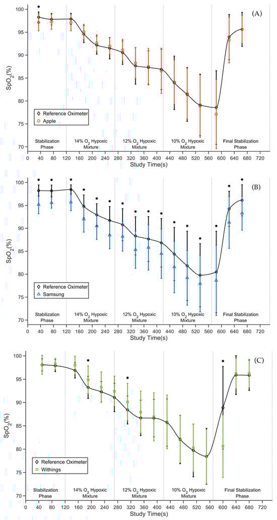 The time courses of the average SpO2 values of Apple Watch 8 (A), Samsung Galaxy Watch 5 (B), and Withings ScanWatch (C) compared to the Radical-7 reference pulse oximeter. Data are presented as mean ± standard deviation. * indicates a statistically significant difference.