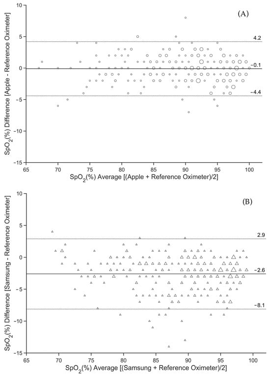 The Bland–Altman analysis was conducted to evaluate the agreement between the SpO2 readings obtained from the smartwatch and the oximeter. This standard approach determines the scatter and bias between measurement methods. The 95% limits of agreement (LOAs) were calculated by adding and subtracting 1.96 standard deviations from the mean bias to provide an estimate of the expected differences between the simultaneous SpO2 readings acquired from the smartwatch and the oximeter. The standard deviation was calculated using the modified Bland–Altman method for multiple observations per individual when the measured quantity changes over the observation period. The mean bias was calculated as the average difference between the smartwatch and the oximeter measurements. Mean bias, LOAs, and Arms between the smartwatch and the reference oximeter were also calculated for subintervals of the entire measured SpO2 range (100–91%, 90–81%, and ≤80%). Paired SpO2 readings were assigned to each interval according to the SpO2 value from the reference oximeter.