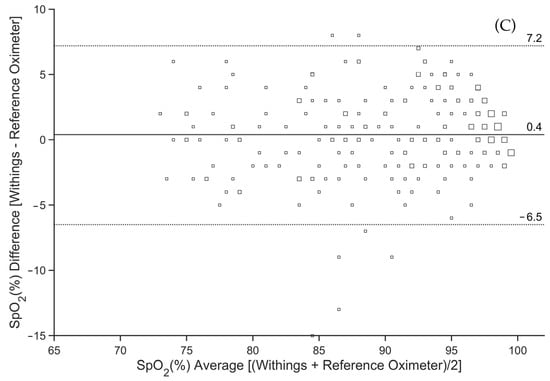 Bland–Altman plots that evaluate potential bias and limits of agreement between the smartwatch and the reference oximeter, derived from all pairs of pooled successfully obtained SpO2 readings, are displayed in Figure 3A–C. The mean bias in SpO2 values measured by the reference oximeter and Apple was −0.1% (Figure 3A), by the reference oximeter and Samsung was −2.6% (Figure 3B), and by the reference oximeter and Withings was 0.4% (Figure 3C). The 95% limits of agreement (LOAs) were found to be between −4.4% and 4.2% SpO2 for Apple, with the largest difference between the smartwatch SpO2 reading and the reference oximeter being −7% in the negative direction and 8% in the positive direction (Figure 3A). The 95% LOA for Samsung ranged from −8.1% to 2.9% SpO2, and the largest difference was −14% in the negative direction and 4% in the positive direction (Figure 3B). The 95% LOA for Withings ranged from −6.5% to 7.2% SpO2, and the largest difference was −15% in the negative direction and 8% in the positive direction (Figure 3C).